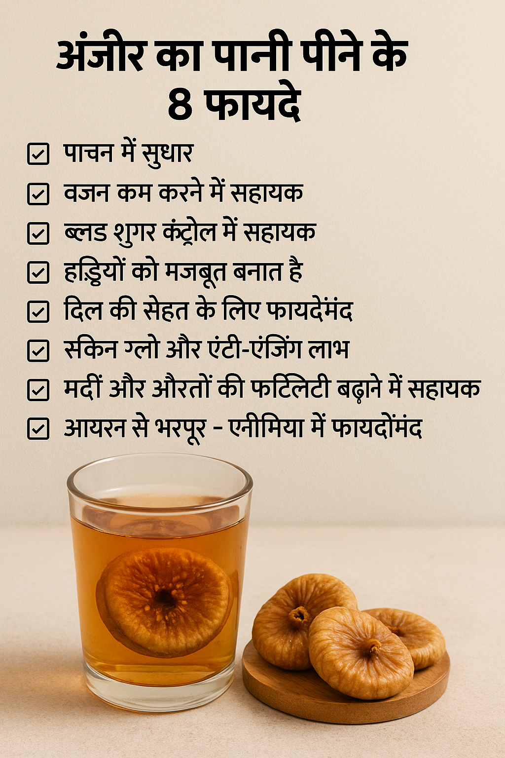 पाचन में सुधार अंजीर का पानी फाइबर से भरपूर होता है, जिससे कब्ज, गैस और अपच जैसी समस्याओं में राहत मिलती है। यह पेट को साफ रखने में मदद करता है।